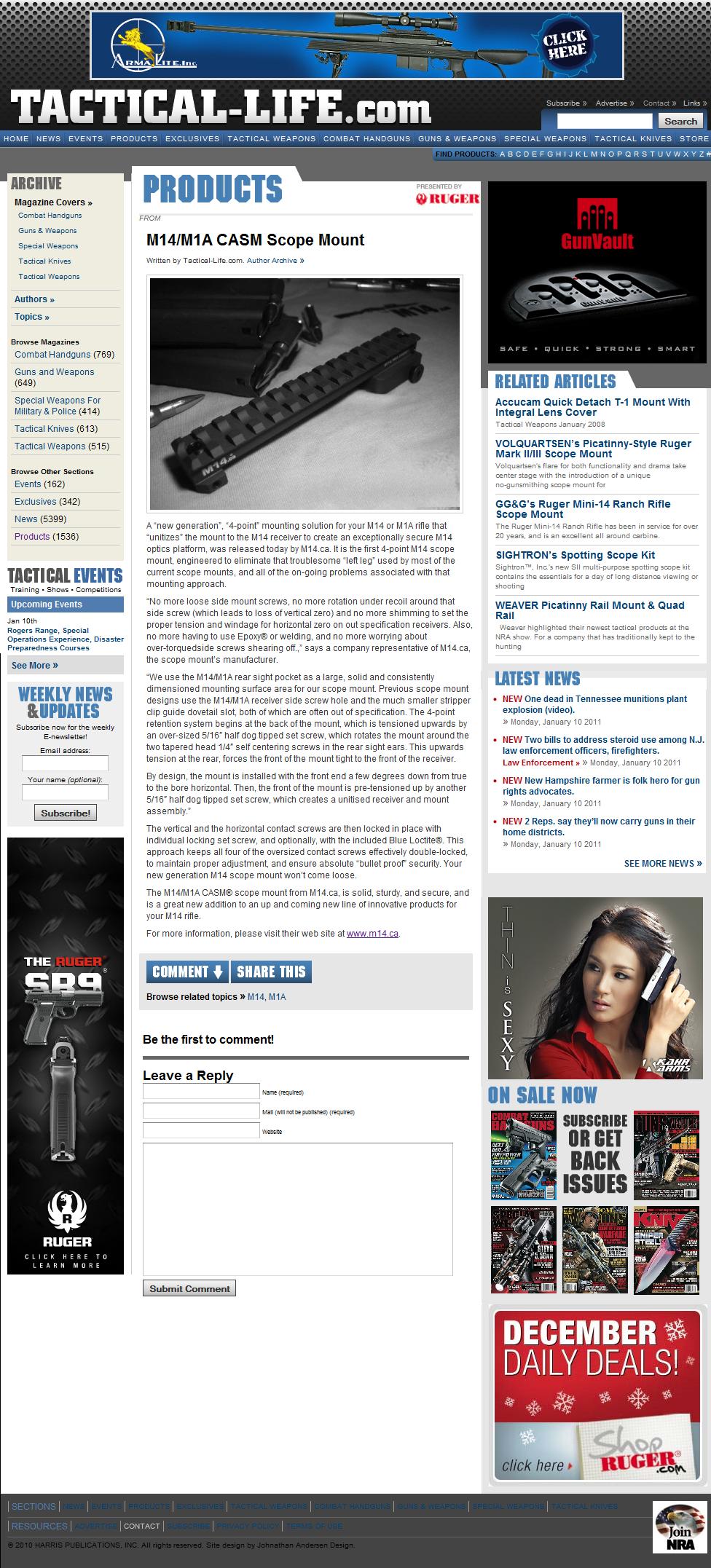 ![]() ![]() The M14/M1A CASM® scope mount was designed in part by an ex-Canadian military officer and a professional gun smith with more than twenty years experience tuning and modifying hundreds of M14 and M1A rifles. Together, we've created a mount that is secure under recoil and will last a lifetime. The CASM® mount is CNC precision machined using 7075 alloy for maximum strength/weight ratio and is Type II hard anodized. It includes a proprietary four point mounting system with 1/4" allen head screws and allen head lock screws to hold adjustments. This mount replaces the rear sight, and uses the much larger, sturdier and more reliable mounting area inside the rear sight pocket, and the solid rear sight ears, rather than using the more common, much smaller stripper clip guide. See our document entitled Engineering and Design Considerations for further review. ![]() ![]() (These two photos show the CASM® Gen. "I" mount. Shipping mounts are Gen. II). Notably, there are no left side mounting legs required on the scope mount. It is designed to interface with M14 railed hand-guards, which pre-empt the use of the left side bolt hole mounting point. The Picatinny rail mounting extends from the front of the receiver all the way back behind the rear sight location. Detailed Installation Instructions can be viewed via the latter link. The M14/M1A CASM® scope mount is high enough to avoid the trapped cartridge case jams found with lower designs and the bolt is easily removed for cleaning without removing the mount. The CASM® ships pre-set for slight angle down at the front for optimum scope adjustment at long ranges. The M14/M1A CASM® scope mount is a solid, sturdy, and secure mount for your M14 rifle. Please review our Product Data Sheet for a list of shipping components. ![]() ![]() M14/M1A CASM® "One of the things I noticed immediately was a definite reduction of the size of my groups. I was using surplus M118 ball, and I have only been able to shoot .75in groups at 100yards. I just thought this was the limitation of my stock NM rifle. The standard removable 3 point mount was replaced with your mount and I was able to immediately put several of the bullets into the same holes, with no more than a .50in between the fliers. Lets just say I am impressed. Thank you for making this mount." -James H., M14/M1A CASM® Owner "I all but gave up on finding a mount for my rifle. I have been through three in the past...and they were all just horrible. The build quality, fit, and design elements [of the M14/M1A CASM®] are outstanding. The instructions were simple and I followed them to the letter without any hitches. Now I know why you don t have to build it out of steel. Your mount is SOLID. I could use it as a carrying handle and wouldn t worry about a thing. " -Van J., M14/M1A CASM® Owner, USN Vet "I received my CASM in well under the time frame stated. Mounting instructions were clear and made mounting a simple, straightforward process. It is the mount for my M1-A that I have been searching for for 20 years. While not inexpensive, by superior design and functionality, it is worth every penny. I, especially, appreciate the built in peep. To date I have only had the opportunity to fire 50 rounds with it installed. Groups were superb and case ejection was not impeded in any way. Rugged, simple, quality material and VERY well thought out design. Thank you for helping me "wring out" the accuracy that my M1-A is capable of. " D.L.B., M14/M1A CASM® Owner "Received the casm mount put it on my Socom 16. The fit was a little snug no issues mounting at all the optic is a leupold patrol VX-R 3x9x40. Going to the range today to sight in will update with groups and distances. Very impressed with the CASM GEN II so far. Possibly looking to upgrade to the complete Blackfeather platform. I'm in the us army. I will be telling all my M14 friends about your mount. The best one so far out of the numerous ones I have tried. Thank you very much. " Jason K., US Army, M14/M1A CASM® Owner "I had a friend help me fit the stock to an M3O5. Everything fit like a dream. Very impressed with your service, packaging, instructions and of course the product. All the best." Hans F., M14/M1A CASM® Owner "Received the mount and was very pleased with the easy and solid install. Have it scoped and ready for the range. Have 4 different bullet grn and 4 different powders loads for each bullet. Feels like Christmas." Conley M., M14/M1A CASM® Owner