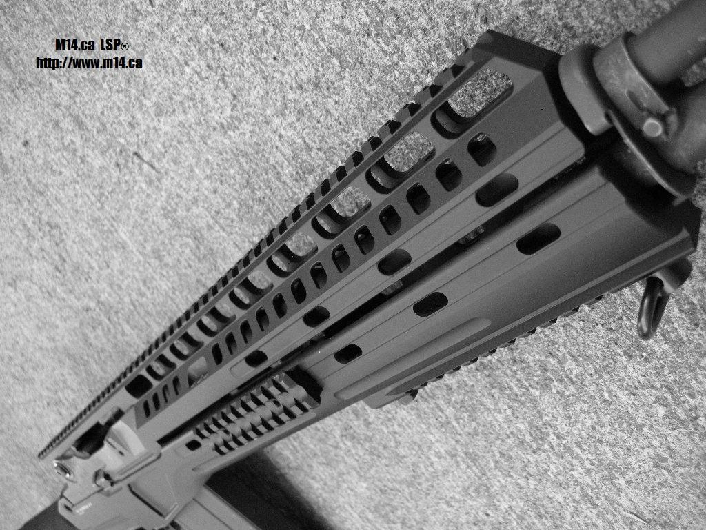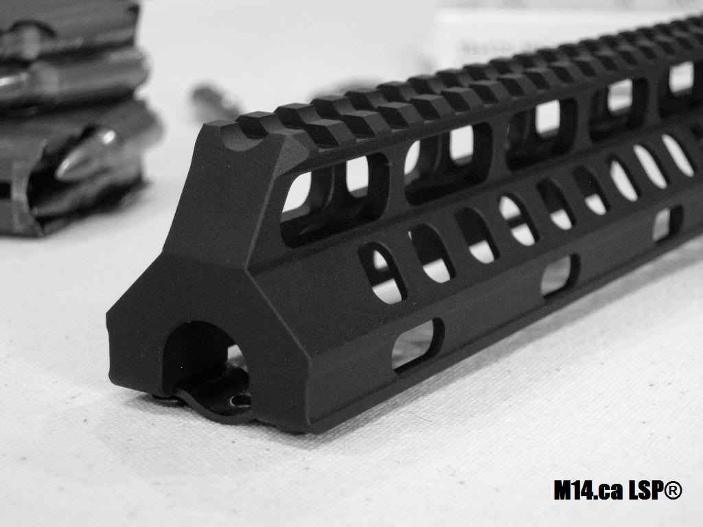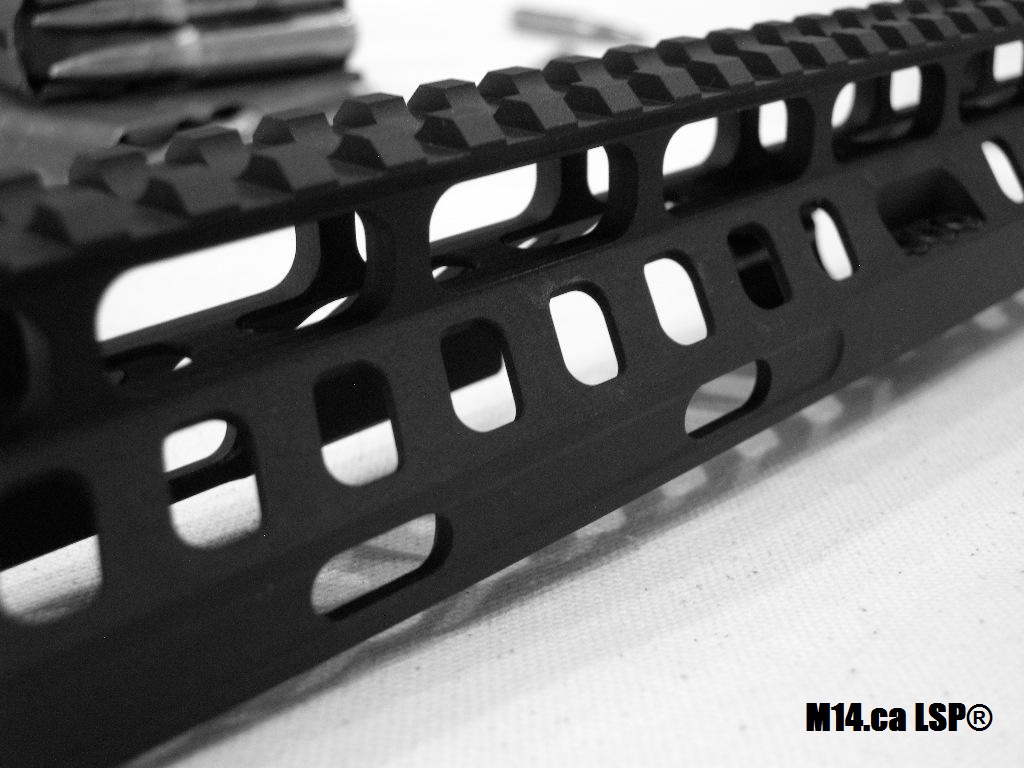 ![]() ![]() The M14/M1A LSP® (Long Sight Plane) hand guard/scope mount/accessory rail replaces the original M1A/M14 hand guard and iron sights and uses a much larger, sturdier and more reliable fitment methodology to provide the lightest and longest single plane rail available for the M14 platform. It is designed to index perfectly on a Blackfeather "RS" equipped rifle, however, it can be installed to other M14/M1A rifle stocks such as wood, nylon, fibreglass and other aftermarket stocks. The LSP® picatinny rail is approx. 20 1/4" long (starts rearward above the M14 receiver's heal, continues through the M14 rear sight pocket and ends at the M14 rifle's front band), weighs 11.7oz., and mounts firmly and rigidly to both the barrel and the M14/M1A receiver's rear sight pocket. After removing the original M14 iron sights and the original handguard, the net weight gain to the rifle is approximately 6oz., and with a scope mounted, the optics weight shift is noticeably rearward. Additionally, the rail extension over the M14 receiver heal allows you to mount a scope or short eye relief scope further rearward while offering space for a rear iron sight. In effect, the LSP® combines the mount design of the M14.ca CASM® "EX" receiver scope mount with the barrel mounted SHG (M14.ca Scout Hand Guard), in a precision machined, monolithic (one continuous piece), ultra long rail that is rigid, sturdy, and weighs about the same as the two other products combined. ![]() ![]() ![]() Along with the long 20 1/4", 12 o'clock mounting location for scopes and iron sights, the LSP® includes mounting points at 3 o'clock and 9 o'clock for 4" lengths of picatinny rail, sold separately (these two rails ship with Blackfeather "RS" rifle stocks). The 4" rail sections are secured in a trackway (on each side), keyed into the LSP and are designed to be optically precise in several locations at 3 and 9 o'clock. Additional mounting points at 10 o’clock 2 o’clock are spaced correctly to allow installation of Magpul® polymer rail sections. While not recommended for optical precision, the polymer rail sections offer an economical and versatile, secondary alternative. The M14.ca LSP® rail is designed to be as long as possible and as light as possible, while still retaining rigidity, strength, and long term durability. Extensive lightening in the undercut, dual channel buttressing of the long, Picatinny rail sectional offers a superior strength to weight ratio over competing designs. This part is precision CNC machined from a single billet of aircraft grade 6061 alloy (it is not extruded and it is not assembled from parts). The internal barrel interface surfaces are fitted to precise tolerances matching up to the barrel contours of a standard weight US GI barrel. In this new design, there is clearance built in to allow perfect alignment of the entire rail over both the barrel and the receiver, with no unwanted bending or flexing. ![]() ![]() ![]() The LSP®'s compression methodology and proprietary bracket design ensure a tight, uniform fitment to the variety of M14/M1A barrels, some of which can vary in dimension significantly. Our new design tightly "straps" the LSP® to the barrel with our custom designed, precision fitted, compression bands made from 4140 steel. Installation requires no gunsmithing and sets up quickly with common tools in as little as 30 minutes. To ensure a tight fit, we use a total of 12 fasteners, 2 proprietary steel barrel "straps," and two, large 1/4"x20TPI socket screws to deliver perfect fitment of rail to barrel and receiver. Blackfeather "RS" owners are also afforded an additional support and connection of rail to rifle due to the precise inletting on the LSP® that matches the Blackfeather RS®'s operating rod guide contour at the top: a fourth leg if you will. Finally, the optical plane of the top of the rail has been designed to be as close to perfect longitudinal alignment with the bore as possible. The rails will maintain zero of precisely aligned, critical optical equipment even when the upper part of the rifle (barrel/receiver groups with LSP attached) are removed for cleaning or for "swapping". For more information, ordering and assembly instructions, please see below.