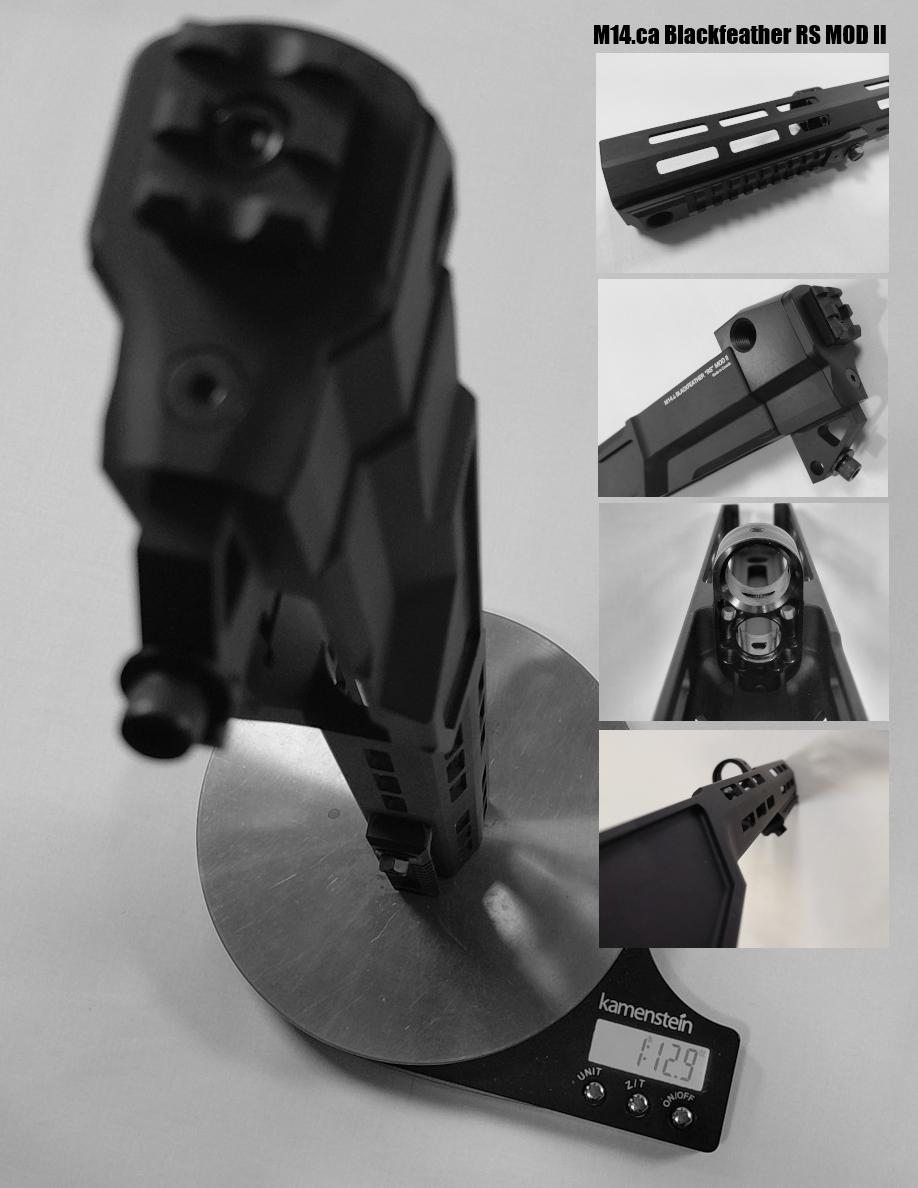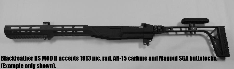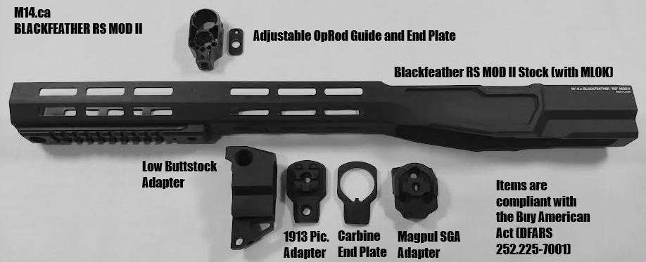 Patterned after our generation one product (c.2012), the Blackfeather® "RS" (MOD II) rifle stock has been re-engineered for 2026; specifically with respect to weight, strength and accurization of the M1A platform. (In stock now. See link below for ordering). The MOD II is comprised of 7 components and is machined out of 6061-T6 U.S.A.-certified aluminum bar and features precision bedding, our proprietary, self-lubricating, adjustable oprod guide barrel tensioner, M-LOK at 3, 6 and 9 o'clock, three removable, interchangeable butt stock adapters and an end plate adapter for industry standard, carbine AR buttstocks providing our end users with the greatest build versatility ever.